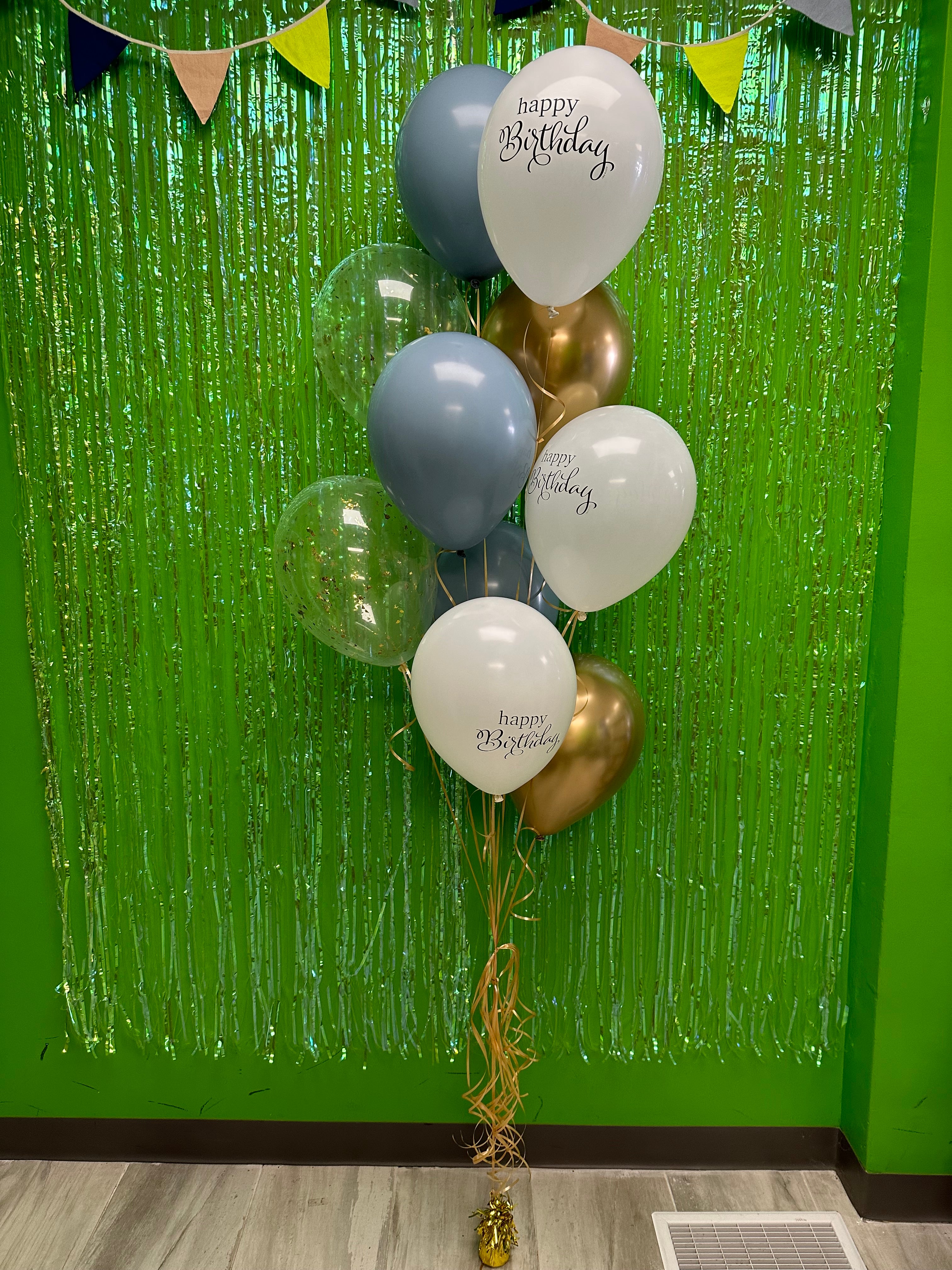 • A mix of 2 x 11” gold metallic shred confetti balloons and  8 x 11 inch latex balloons (2 x chrome gold, 3 x dusky blue and 3 x simply happy birthday)
